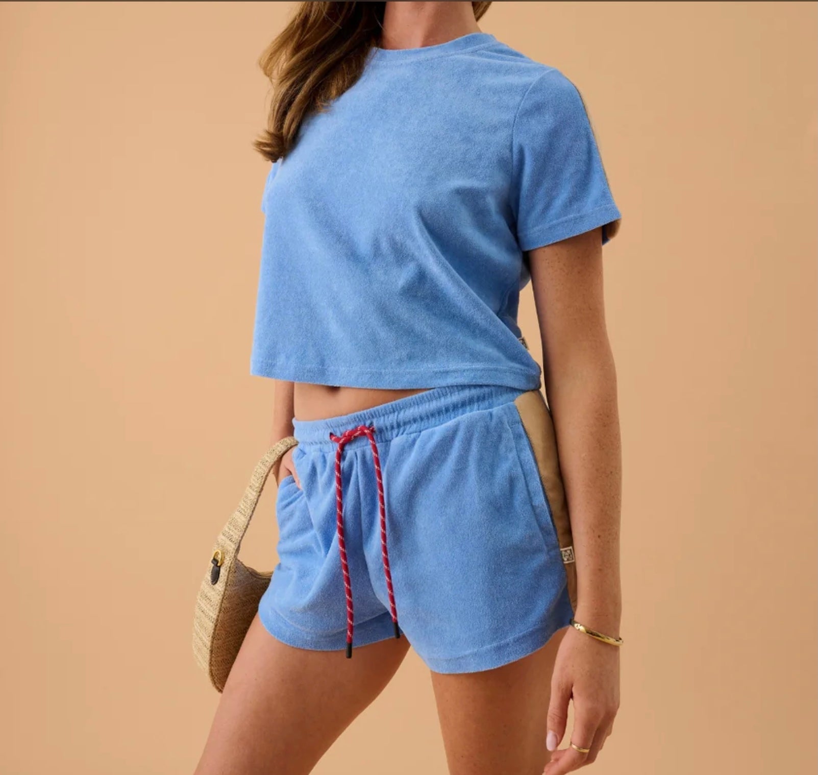 Introducing the Palma Terry Set in Cornflower. Crafted in soft and luxurious terry towelling fabric with macadamia coloured side panels. The classic tee shaped top is perfectly complemented by the matching shorts, featuring a flattering elastic waistband and functional side pockets. This set is the ideal combination of comfort and style.